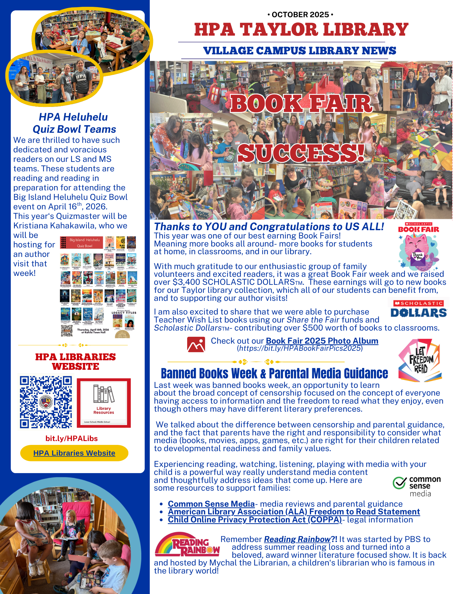 • Library: Mrs. Tarnas has a special thank you for all who contributed to the book fair, with an update on earnings and a photo album. Our HeluHelu Quiz Bowl participants continue to meet regularly under her guidance, and our library classes have engaged in learning on censorship, among other topics. Please feel welcome to browse our library with your keiki any day after school. Mrs. Tarnas is always happy to help students select “just right” books for their independent reading. Take a look here for all our library updates.