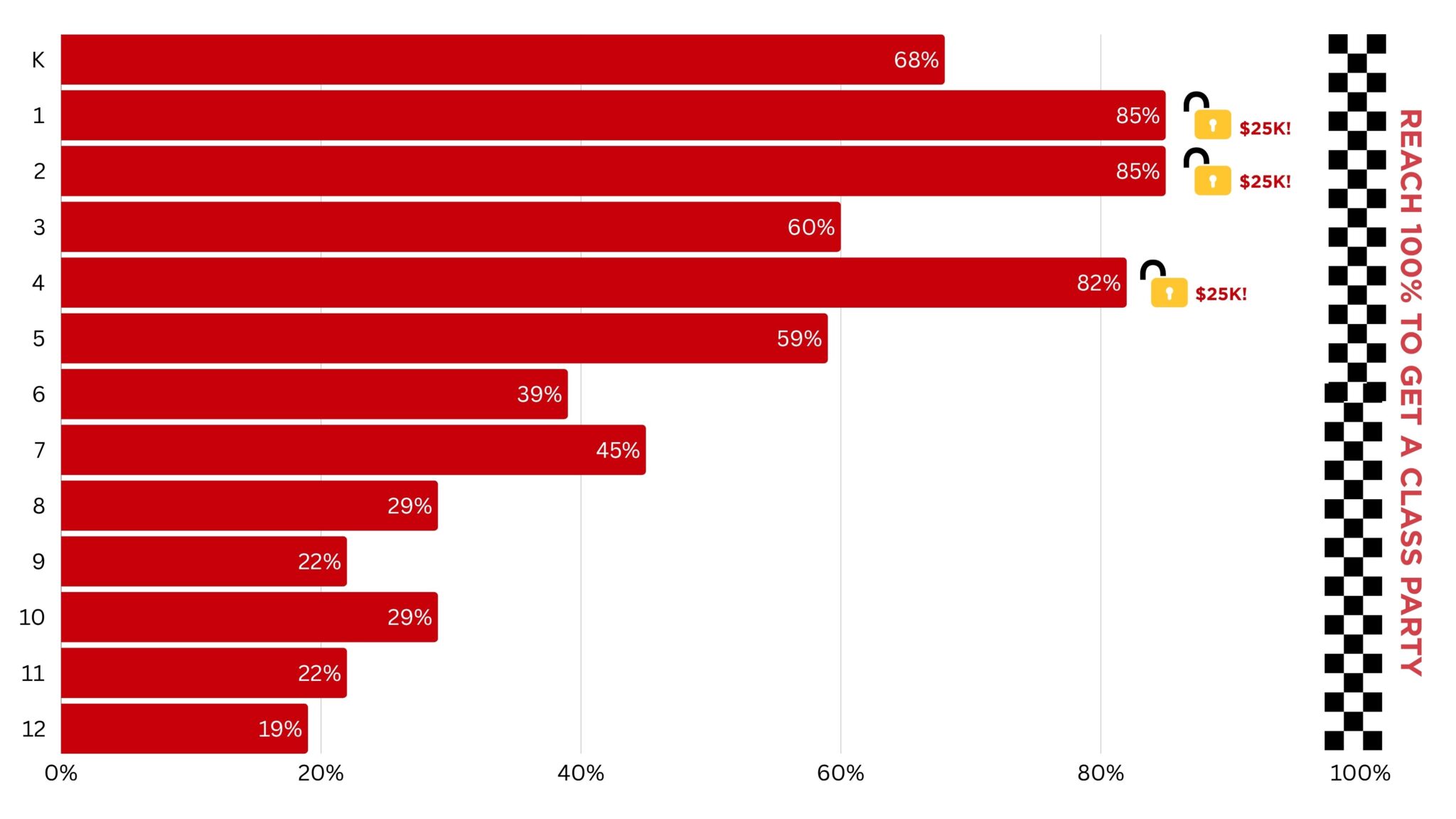 Our 1st and 4th graders have also joined 2nd grade in surpassing the 80% participation milestone! First and second grade are neck-and-neck at 85%, with 4th grade right behind at 82%. The race is heating up — which class will be the first to reach 100% and earn a pizza party?