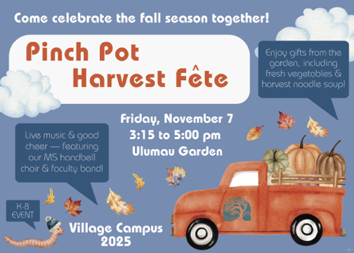 We are thrilled to invite all families and friends to our upcoming Harvest Fête! This annual fall gathering celebrates the season of gratitude and giving. As in years past, you can look forward to delicious bowls of soup noodles, fresh treats from our garden, and music from our Middle School handbells and our talented faculty band. Each Lower School student will also take home their own handcrafted pinch pot — this year with some especially creative embellishments. The entire event is hosted by our Village Campus, and we hope you’ll join us for this time of warmth, connection, and fun. Many thanks to Mrs. Hustace, Mrs. Prutow-McKenna, and Ms. Marchildon for leading this wonderful event. If you’d like to volunteer, there are still a few spaces available on our ʻOhana Sign-Up Sheet.