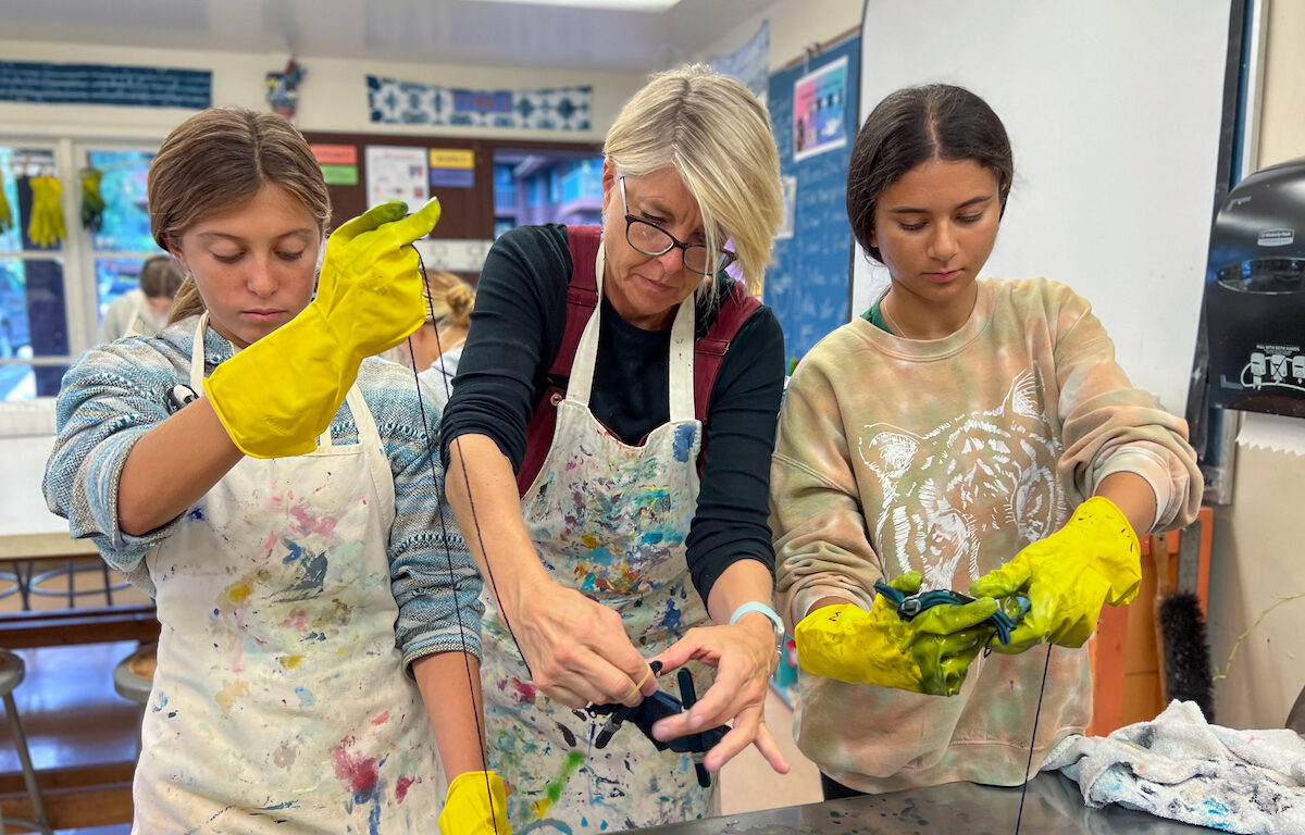 Middle School students work with Ms. Marchildon on a fiber arts project during an Indigo dyeing lesson.