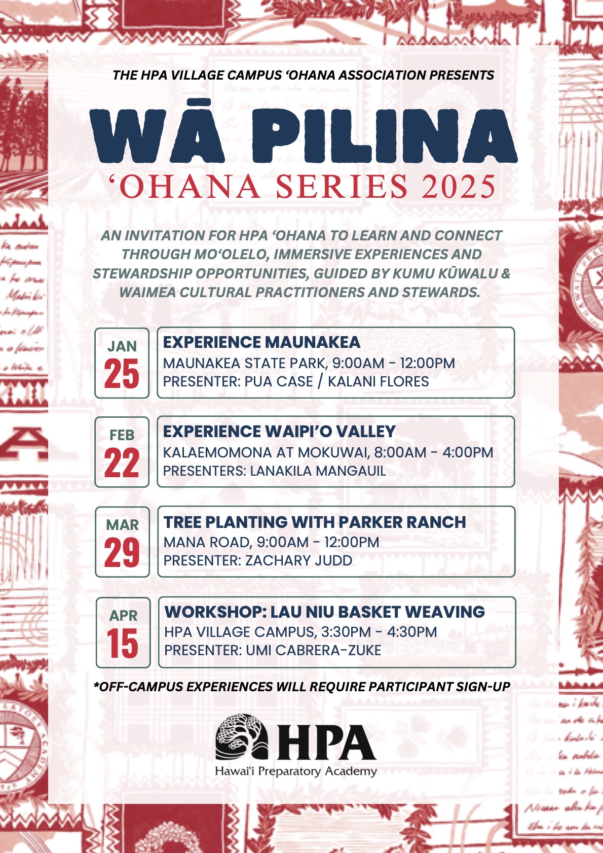 Our ʻOhana Association hosts a variety of events and activities for our school community throughout the year. As parents of HPA, you are automatically part of the ʻOhana Association. There are many ways to participate, and we encourage everyone to get involved. It is a great way to meet your fellow parents and support our amazing Ka Makani community. Mark your calendar for these upcoming events, and be sure to email ohana@hpa.edu with any questions, or to find out what volunteer opportunities are available!