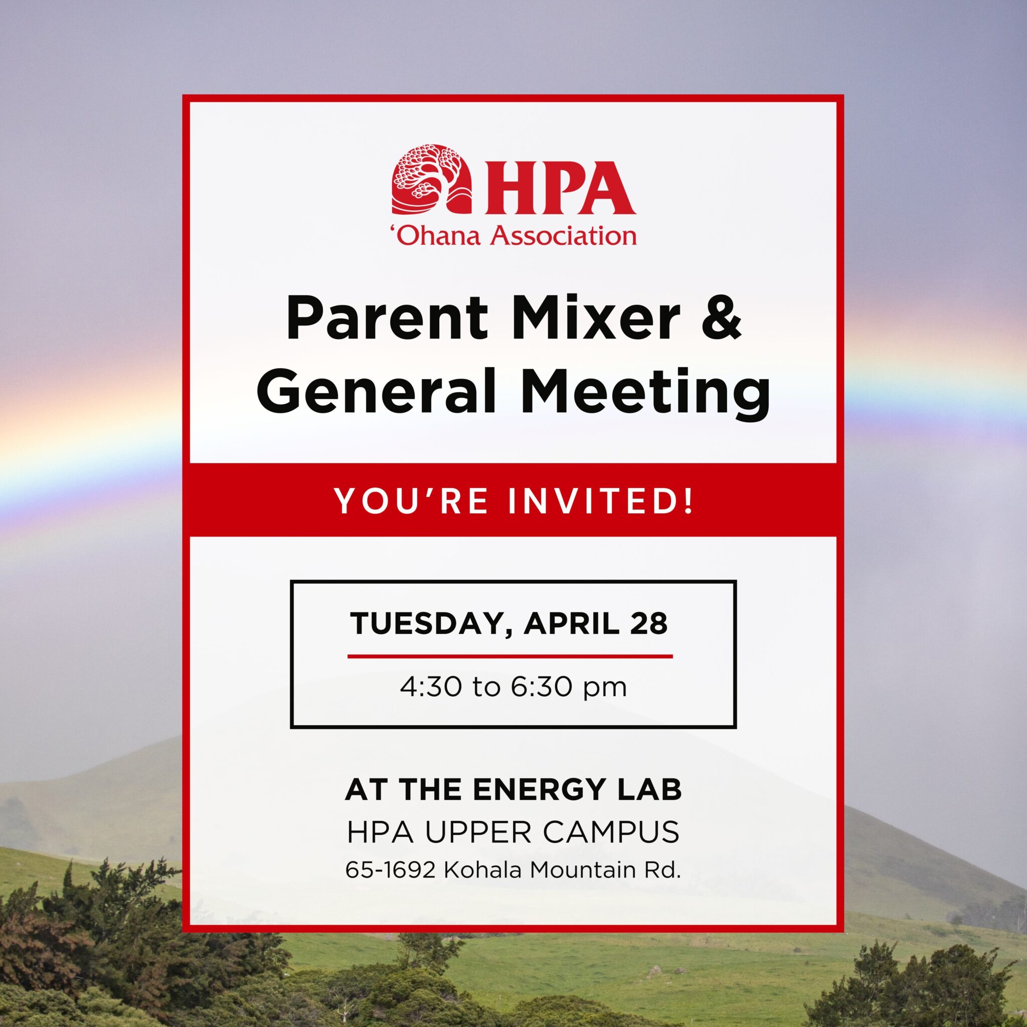 • Tuesday, April 28: ʻOhana Association Annual Spring Meeting & Parent Social, 4:30 to 6:30 pm, Upper Campus Energy Lab