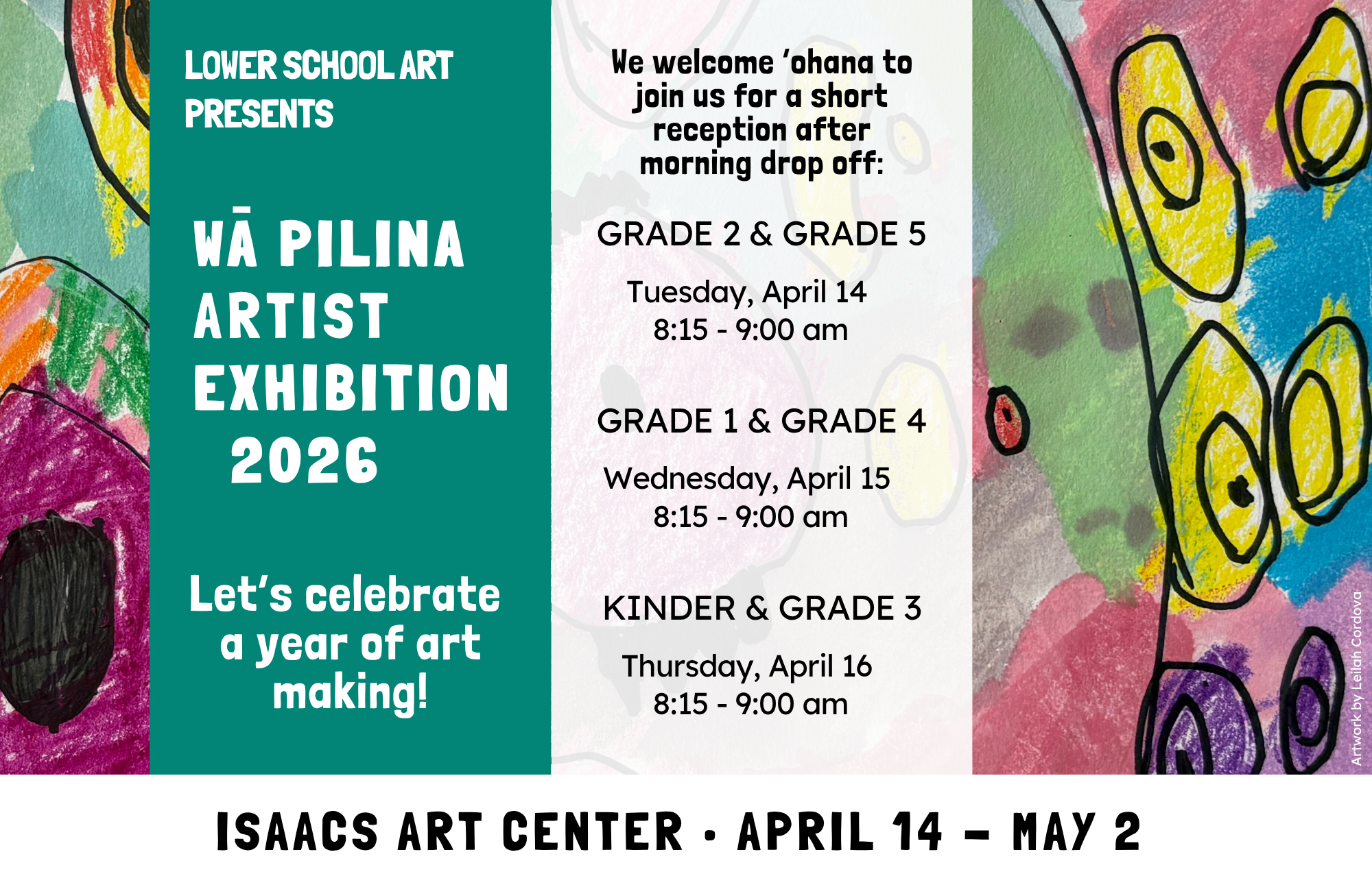 Finally, Mrs. Alexa Hustace, our K–5 Art Teacher, is thrilled to announce our annual K–5 Wā Pilina Art Exhibition. We look forward to gathering as a community to celebrate a year of art-making at our Wā Pilina artist receptions with students and their families, held at Isaacs Art Center! At this special annual exhibit, your child will showcase a favorite artwork and connect with fellow artists. Please take note of the different reception times for each grade level on the flyer below, as classes are paired in their Wā Pilina partnerships. Leading up to the exhibition, students will continue to engage in special cross-grade experiences—mentoring, collaborating, and learning together in the spirit of pilina and haʻina.